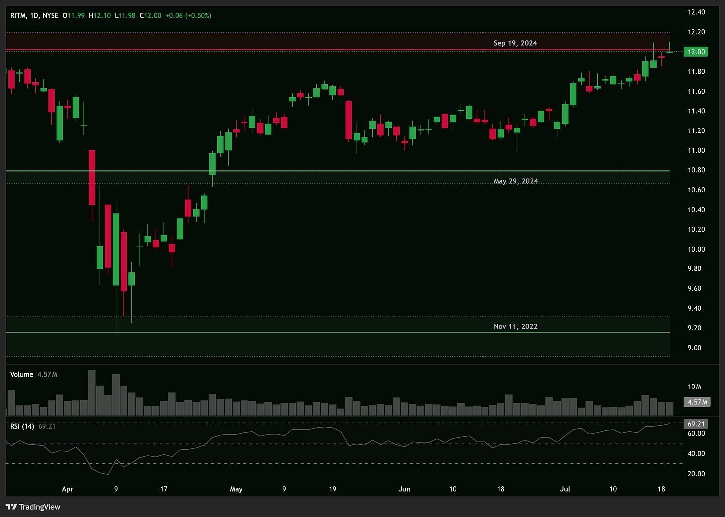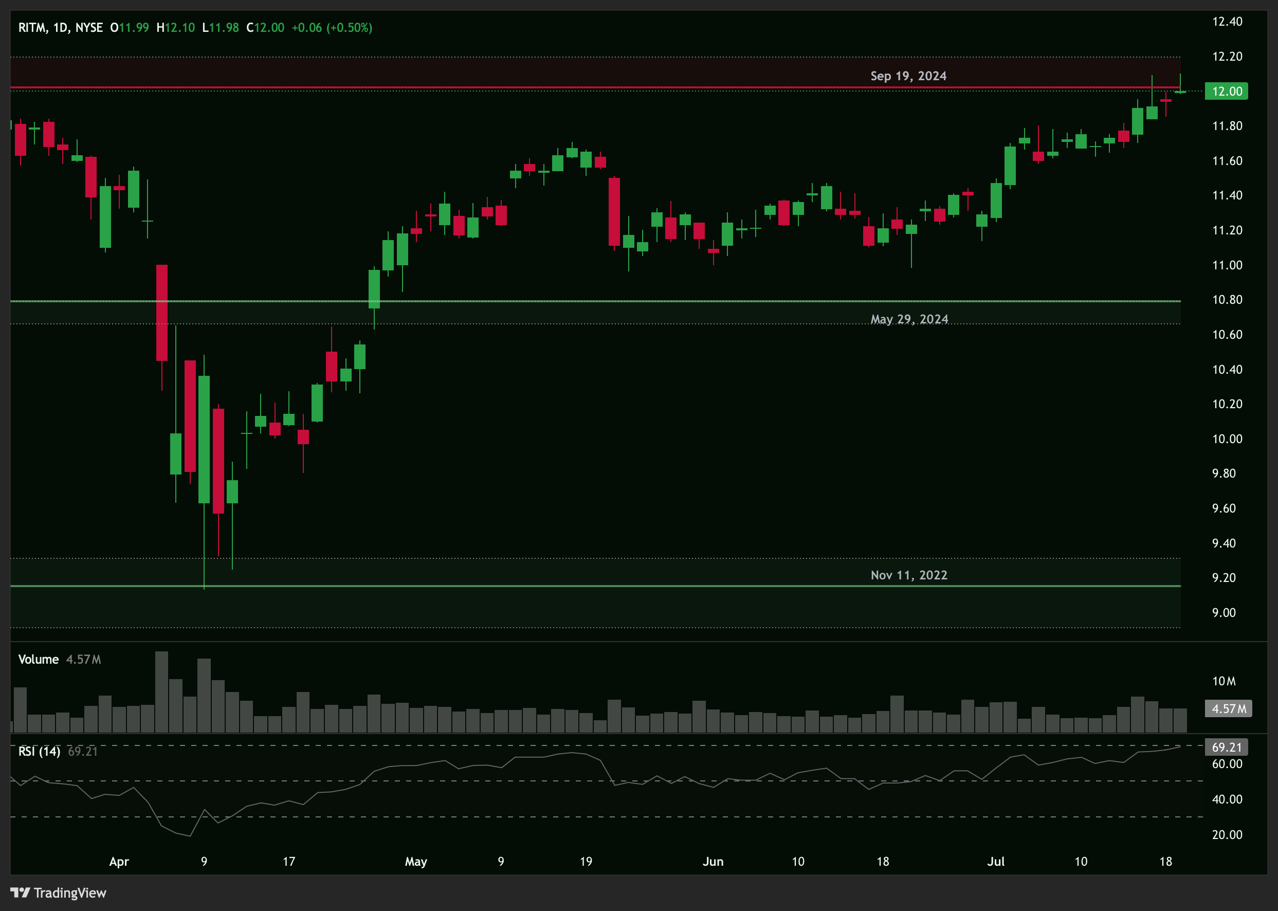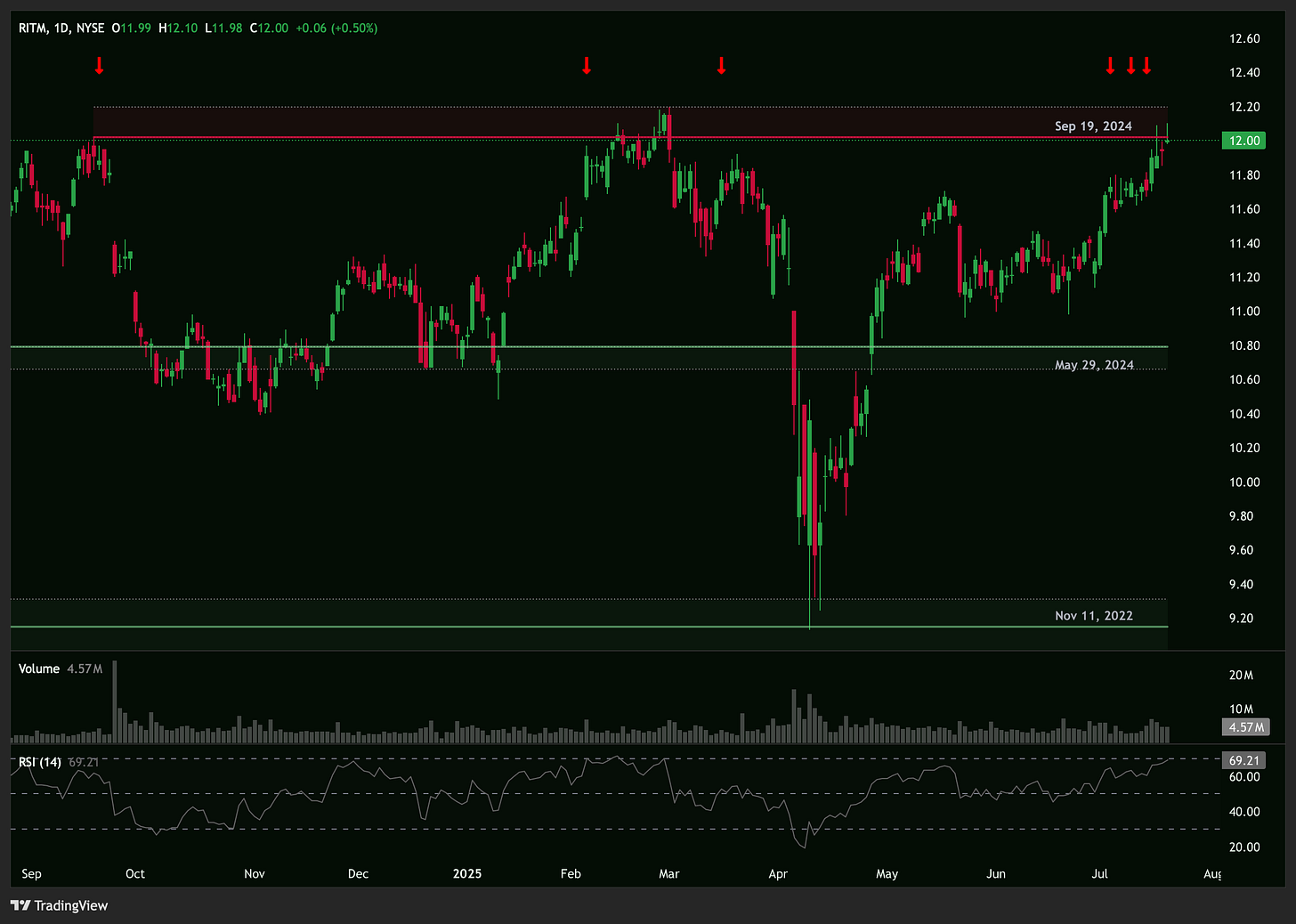 RITM is the oddball on our list—a sleepy real estate play that’s suddenly ripped ~30% off the May lows. But that sprint has got it poking right into a heavy resistance zone from September 2024—one that it’s never managed to conquer.