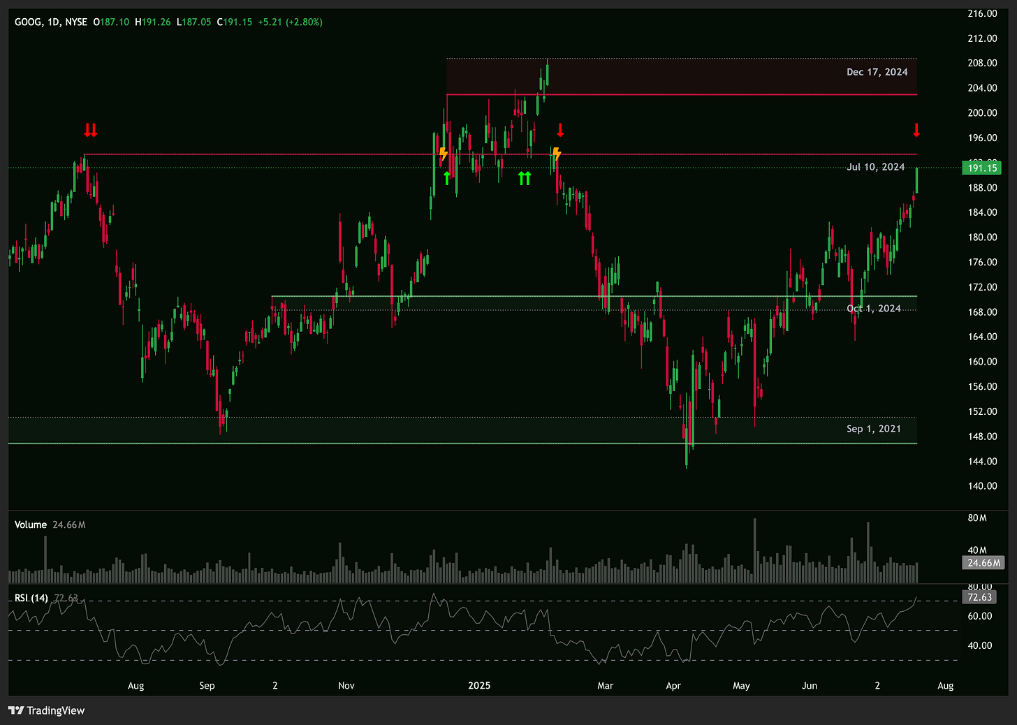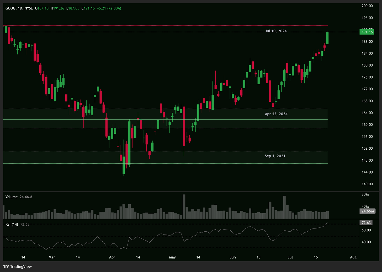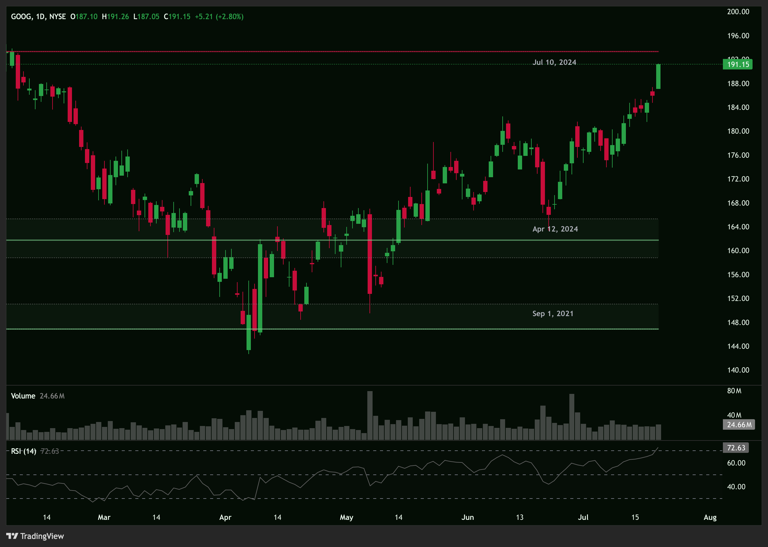 GOOG’s rally has been a bit stealthier than our previous pick—but still nothing to scoff at. The stock’s climbed ~25% in under two months, and with yesterday’s strong green candle, you’d think it’s gearing up for more.
