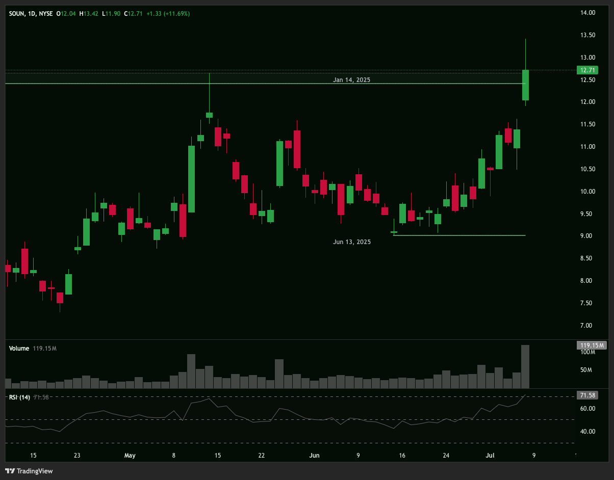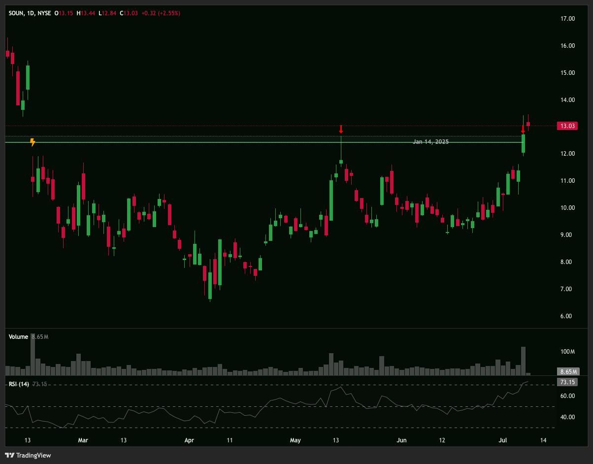 If you look real close at yesterday’s close (and today’s open), you’ll see that SOUN (currently $13.03 as of writing) is already above its January 2025 zone.