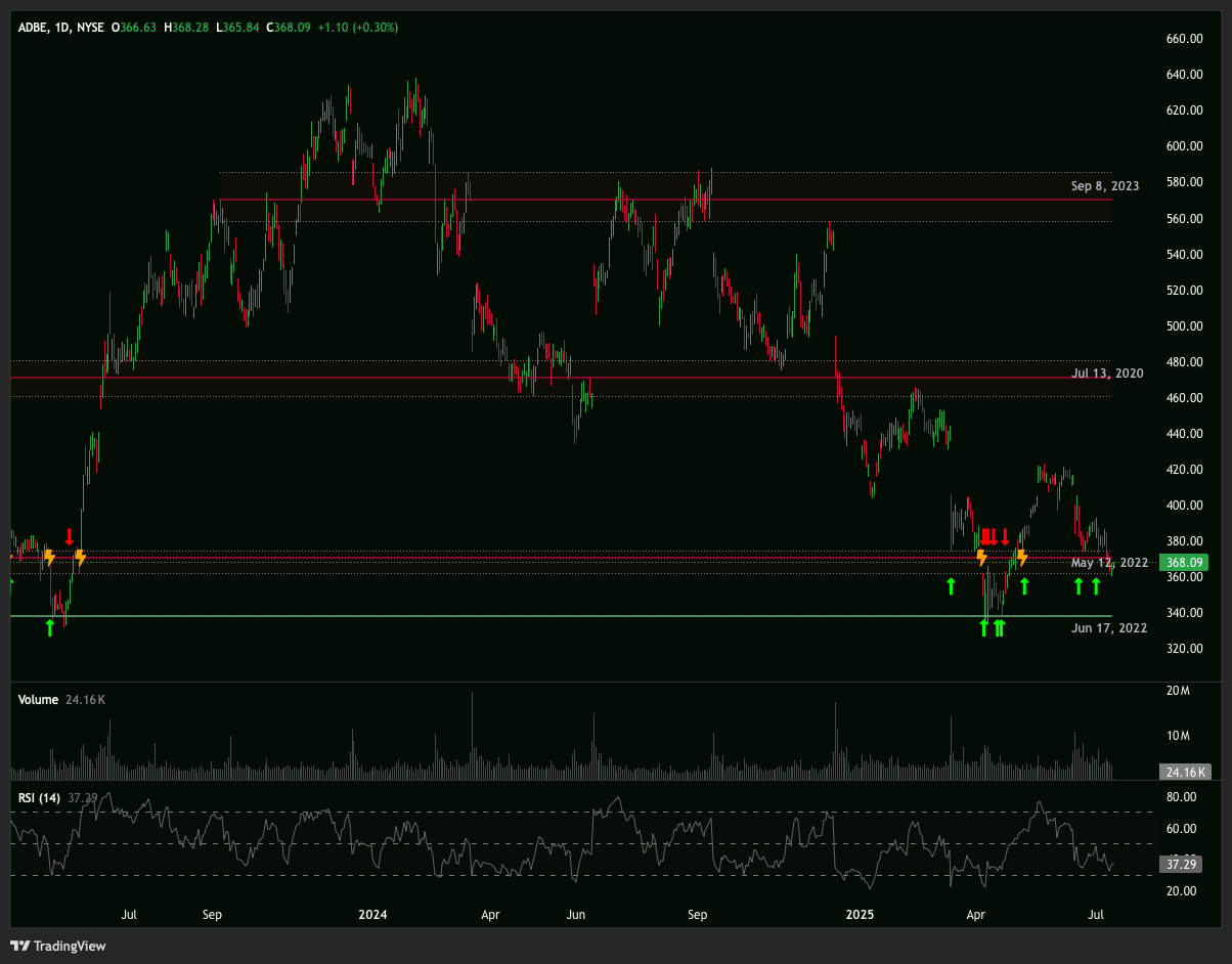 Just a few months ago, ADBE bounced cleanly off a major support zone from June 2022—the same level that once triggered a monstrous 7-month, 87% climb. That zone’s clearly got some strength behind it, and the stock respected it again this past April.